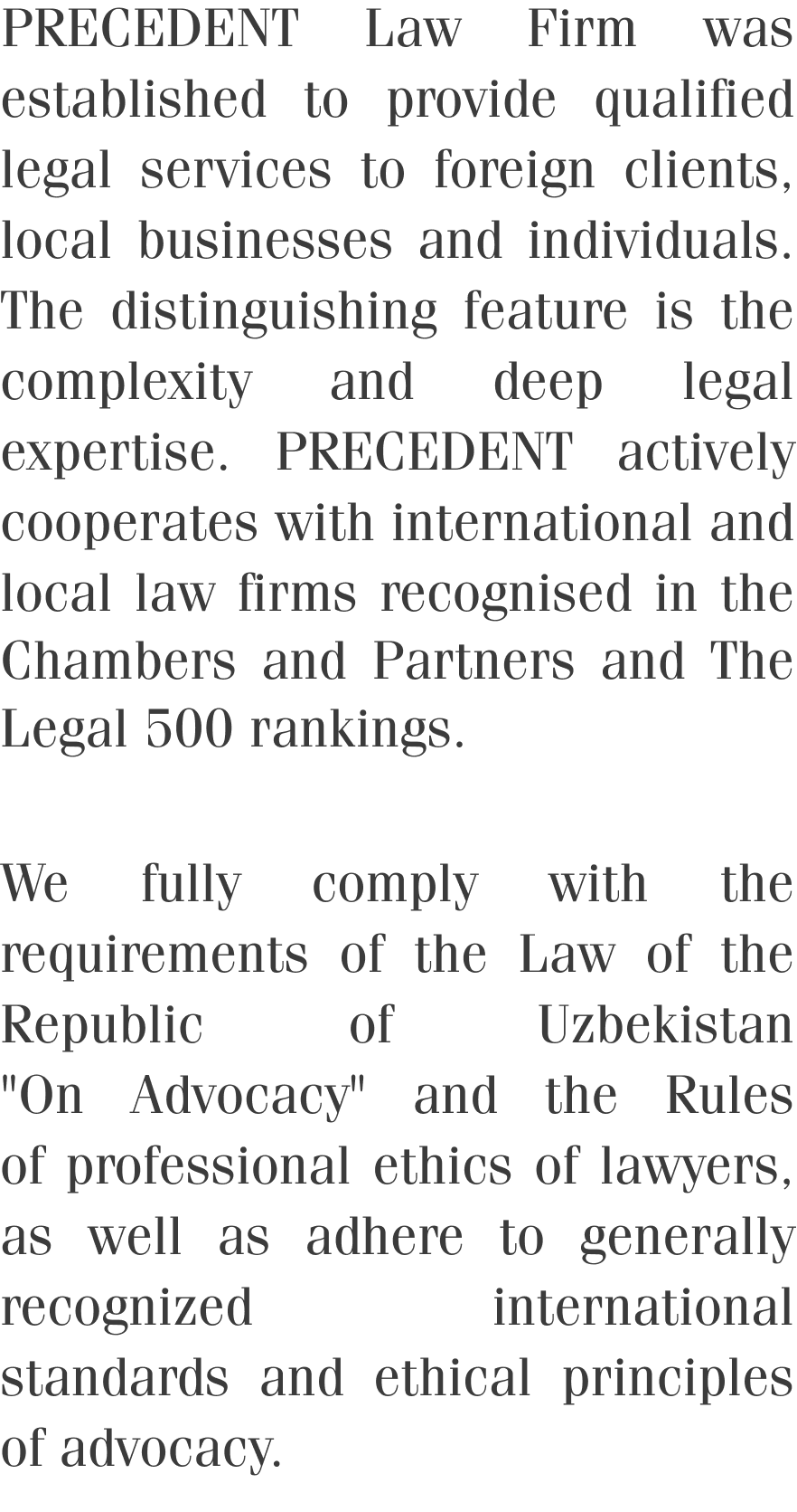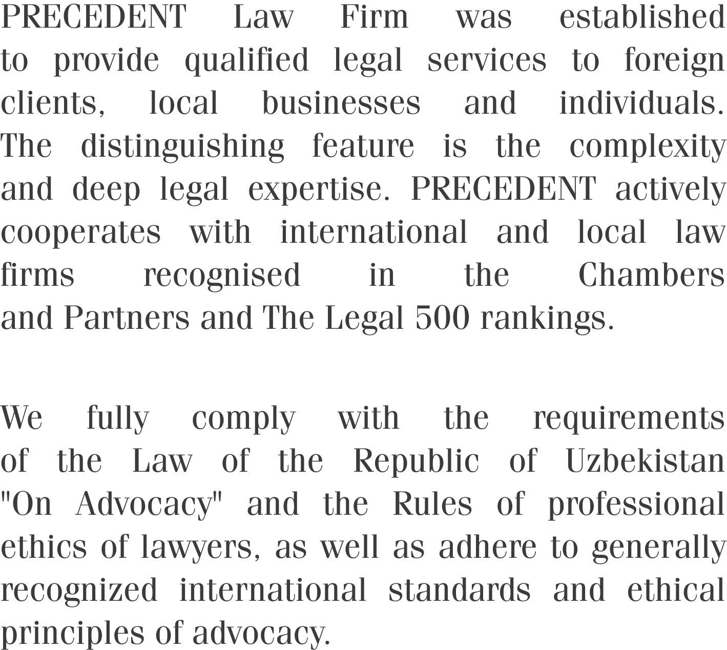 We fully comply with the requirements of the Law of the Republic of Uzbekistan "On Advocacy" and the Rules of professional ethics of lawyers of the Republic of Uzbekistan, as well as adhere to generally recognized international standards and ethical principles of advocacy.