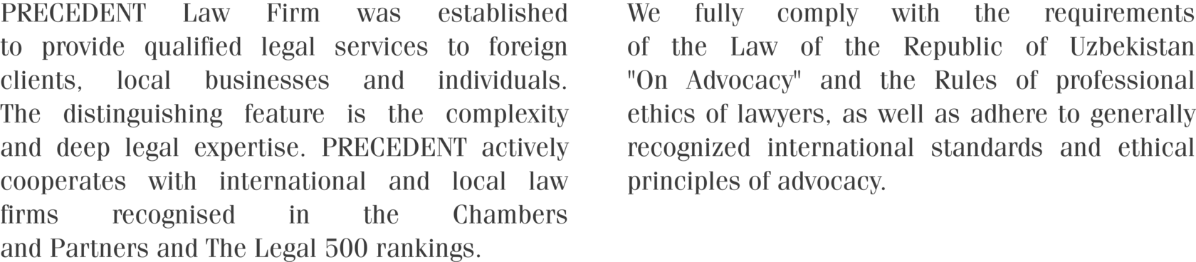 PRECEDENT Law Firm was established to provide qualified legal services to foreign clients, local business structures and individuals. The distinguishing feature of the Firm is the complexity and deep legal expertise. The Firm actively cooperates with international and local law firms recognized in the Chambers and Partners and The Legal 500 rankings.